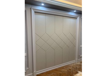 二、型條軟包。施工工藝:先將型條按需要圖形固定在墻面,中間填充海綿,最后用塞刀把布或皮革塞在型條里。